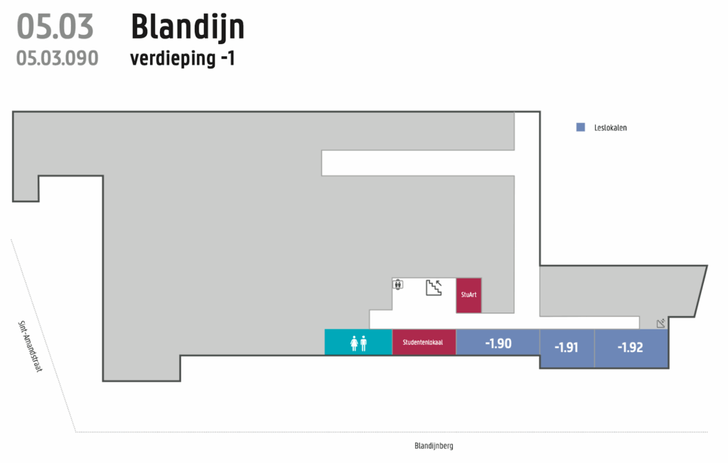 Je bereikt ons via de hoofdingang van de Blandijn: meteen binnen zie je een trap die naar beneden leidt, waar je in een open ruimte komt. Daar vind je de blauwe deur naar ons lokaal (zie grondplan ‘studentenlokaal’).
